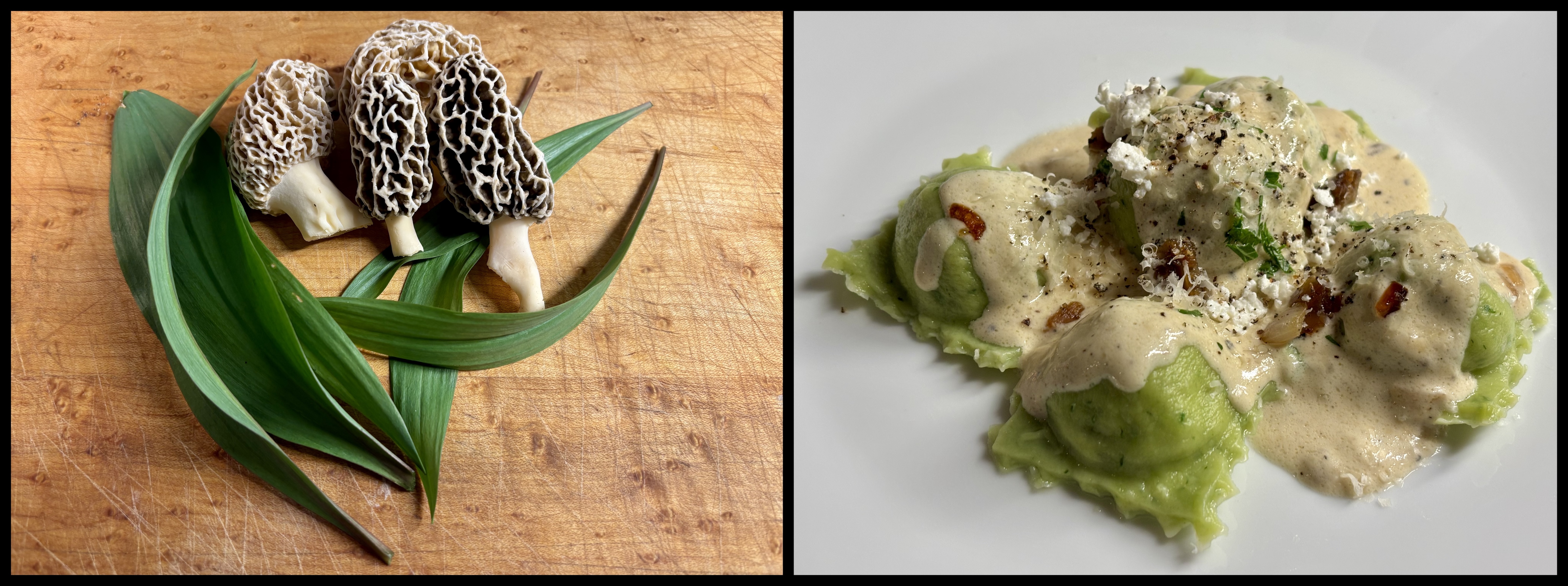 Okay, with that out of the way, onto the fun! This ravioli with cream sauce combines the ramps into the pasta dough, with a ravioli filling of morels, shallots, and goat cheese. The mix of morel and goat cheese is also a perfect pairing (this combo is also nice if you only have a small morel harvest and can make small crostinis with goat cheese crumbles).